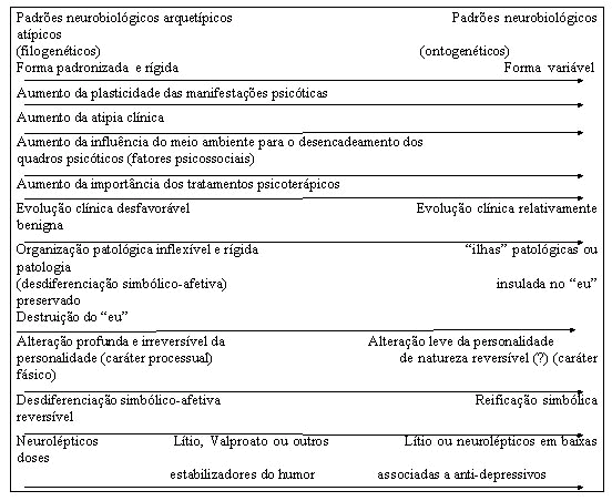 Souza, G. F. J.* *Médico Psiquiatra Preceptor da Residência de Psiquiatria do Hospital das Clínicas da UFMG UNITERMOS: Tipicidade e Atipicidade psicóticas Estados Psicóides Espectro Psicótico Desdiferenciação simbólico-afetiva Reificação Filtro caracterológico Psicopatologia Fenomenologia RESUMO: O Autor, através da exposição de dois casos clínicos, estabelece aquilo que denomina tipicidade e atipicidade psicóticas e compara os quadros psicóticos incaracterísticos com aqueles mais típicos, em especial a esquizofrenia. Partindo dessa comparação, desenvolve um modelo teórico que culmina em uma representação diagramática das diversas unidades nosológicas pertencentes ao âmbito das psicoses endógenas , situando-as no interior de um spectrum próprio de acordo com o critério de maior ou menor tipicidade apresentada. O A. acredita que essas considera ções teóricas poderão enriquecer o instrumental semiológico psiquiátrico e, dessa maneira, tornarem-se úteis para que o médico se situe com maior precisão e segurança diante de quadros psicóticos atípicos no que diz respeito ao diagnóstico e tratamento. INTRODUÇÃO: A prática clínica do dia a dia no manejo das manifestações psicóticas em geral oferece-nos numerosos exemplos de quadros psiquiátricos fenomenologicamente incaracterísticos e, até certo ponto, nosologicamente intrigantes. O raciocínio clínico de qualquer psiquiatra diante desses casos, naturalmente, volta-se, de início, para aqueles quadros clássicos psicóticos com conteúdo psicopatológico bem estabelecido e delineado, ou seja, típicos, procurando alguma semelhança fenomenológica com eles, desde que se constituem em modelos de referência clínica obrigatórios e inevitáveis. Entretanto, muitas vezes, os enfermos relatam vivências anômalas tão surpreendentes e apresentam evolução clínica tão inesperada e imprevista, que o médico não é capaz de reconhecer, pelo menos inicialmente, a verdadeira natureza nosológica desses quadros, limitando-se a tratar o seu teor sintomatológico, prejudicando em muito o controle efetivo da doença e protelando a ressocialização dos pacientes. Desse modo, creio que se faz necessário o estabelecimento de novos referenciais teórico-práticos capazes de esclarecer e elucidar certas configurações psicopatológicas que, apesar de atípicas, estejam bem descritas e consolidadas fenomenologicamente. Para cumprir essa finalidade, neste trabalho, iniciaremos nosso propósito com a apresentação de dois casos clínicos de psicose atípica e, posteriormente, empreenderemos uma discussão teórica a respeito deles, culminando em uma interpretação dimensional dos transtornos psicóticos em geral. RELATO DE CASOS: Primeiro Caso Clínico (1 ): W. , 17 anos, sexo feminino, solteira, estudante (escolaridade: 1º grau não concluído) Residia em companhia da irmã mais velha em Belo Horizonte. Os pais haviam se separado há três anos. Os familiares entraram em contato comigo em junho de 1989 solicitando atendimento de urgência. Segundo a irmã, há uma semana, a paciente começou a apresentar mudança em seu comportamento. Apareceu, em determinada manhã, trajada com um vestido de baile, dizendo que se havia vestido daquela maneira para receber seu pai que, segundo ela, chegaria a qualquer momento (o que não era verídico). Além disso, exibia atitudes bastante infantis, medos infundados, insônia, inquietude e agitação, sendo contida com muito esforço. Ao exame, apresentava uma espécie de puerilidade travessa, entrando no consultório saltitando e pulando, cumprimentando-me com uma curiosa inflexão infantil na voz. Não conseguia permanecer sentada por mais de alguns segundos, denotava desatenção e inquietude, a expressão facial comunicava angústia, apreensão, desconforto, medo e mexia incontrolavelmente os pés e as mãos como uma verdadeira criança. Disse estar com muita saudade do "papá" e, ainda, com muito medo porque estava presenciando "visões de caras feias como monstros" (sic). Não havia evidências, ao exame, de atividade delirante ou alucinatória, a atenção era hipervigil e hipotenaz numa espécie de distraibilidade desassossegada e o pensamento, memória, consciência e consciência do eu monstravam-se aparentemente íntegros. Antecedentes Pessoais (A. P.): uso irregular de maconha; ausência de passado comicial e de outras doenças significativas; escolaridade prejudicada por várias repetências; vida amorosa tumultuada e inconstante. Antecedentes Familiares (A. F.): mãe portadora de transtorno depressivo recorrente (transt. monopolar crônico); um dos irmãos e tia materna com provável quadro psicótico. Conduta terapêutica: Prescrevi propericiazina na dosagem de 40 a 60 mg/dia mas, passadas quarenta e oito horas, como a paciente em nada melhorasse, indiquei hospitalização imediata. Durante esse período, que correspondeu a quinze dias, usou 25 mg de enantato de flufenazina associado a 15 mg de haloperidol/dia e a 200 mg de clorpromazina/dia, havendo remissão completa do quadro agudo. Em maio de 1990 voltou ao consultório acompanhada dos familiares, com sintomas sugerindo pródromo de outra crise semelhante à anterior. Havia abandonado os medicamentos prescritos e, há cinco dias, voltava a apresentar inquietação, insônia, além de medos vagos e imprecisos. Prescrevi palmitato de pipotiazina (1 ampola de 25 mg IM) associado a 40 mg/dia de propericiazina e, após uma semana, sua irmã comunicou-me que ela havia melhorado bastante. Não tive mais notícias dessa paciente até 03/12/91, quando voltou ao consultório apresentando perda da capacidade de locomoção, além de mostrar-se bastante assustada, temerosa e insone. Prescrevi palmitato de pipotiazina (50 mg IM), retornando depois de uma semana para controle. Estava adequada, síntone, locomovendo-se normalmente, porém exibia choro fácil e labilidade afetiva. Acrescentei amitriptilina (75 mg/
