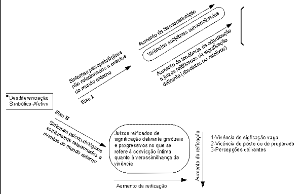 1 - sintomas psicopatológicos estritamente relacionados a eventos do mundo externo 2- sintomas psicopatológicos não relacionados a eventos do mundo externo No primeiro caso, um estímulo externo, uma determinada circunstância situacional, enfim, uma vivência perceptiva ou um grupo encadeado de percepções deflagram um ou mais juízos delirantes intimamente relacionados e intrinsicamente vinculados àqueles, enquanto, no segundo caso, uma vivência sensorializada passa a ocupar o espaço subjetivo destinado a abrigar os conteúdos psíquicos oriundos do mundo exterior, ou seja, é projetada, misturando-se e revestindo os objetos situados no espaço externo, podendo ou não, como já vimos, vincular-se a juízos delirantes diretamente relacionados a esses mesmos objetos. Pertencem à primeira classe de fenômenos os seguintes: vivência de significação vaga, vivência do posto ou do preparado e as percepções delirantes. Incluem-se na segunda categoria de fenômenos a difusão do pensamento, a produção ou roubo do pensamento, as vivências de influência sobre a corporalidade, sentimentos e ações, as alucinações psico-sensoriais e alucinações psíquicas. Pode-se observar, com clareza, que existe uma gradual transição no que se refere ao grau de reificação - resultante do processo de desdiferenciação simbólico-afetiva - dos juízos delirantes em consonância com o aumento da convicção íntima, por parte do enfermo, quanto à verossimilhança da vivência nos sintomas do primeiro grupo, ou seja, aqueles relacionados a eventos do mundo externo. Por outro lado, no que se refere aos sintomas psicopatológicos não relacionados aos eventos do mundo externo, a ordem hierárquica das vivências sensorializadas, como foi colocada acima, corresponde ao espectro da gradação progressiva da intensidade de sensorialização resultante do processo de desdiferenciação simbólico-afetiva. Como já vimos e dissertamos suficientemente a respeito dos sintomas psicopatológicos não relacionados a eventos do mundo externo, isto é, as vivências subjetivas sensorializadas, nos ocuparemos, a seguir, daqueles sintomas psicopatológicos estritamente relacionados a eventos do mundo externo. A vivência de significação vaga, que costuma surgir na etapa do humor delirante difuso, refere-se a uma impressão subjetiva embebida de extrema expectativa ansiosa, indefinida, nebulosa e angustiante que se instaura sobre um fundo auto-referencial significativo. Tudo parece convergir em direção ao enfermo, gestos, olhares, expressões faciais adquirem um tom especial, singular e vagamente ameaçador. Diálogos entre duas pessoas desconhecidas e vislumbrados à distância pelo paciente transformam-se em murmúrios e sussuros audíveis sob a forma de comentários vagamente desabonadores a seu respeito. Por vezes, parece ouvir, nitidamente, uma palavra insultuosa em tom de zombaria insolente que lhe é dirigida por uma fonte imprecisa e indeterminada. Simultaneamente, é tomado, de modo súbito, pela convicção de que todos estão percebendo o conteúdo de seu pensamento de uma forma inexplicável e angustiosamente intrigante e, vez por outra, vivencia a experiência insólita de que está ouvindo o seu próprio pensamento. Um passo a mais, na vivência do posto ou do preparado, o enfermo, ao chegar em determinado lugar, por exemplo, é dominado, imediatamente, pela abrupta e irrefutável certeza de que determinadas pessoas e/ou objetos estão intencionalmente colocados e dispostos com uma finalidade malévola e inequivocamente declarada em relação a ele, enfim, tudo no mundo exterior, se move e se configura de uma forma intencional e preparada. O acaso e o inesperado do cotidiano comum e trivial convertem-se em fatos e ações carregados de singular intencionalidade e de propósito enigmaticamente voluntário relacionados a ele mesmo. A etapa seguinte de acentuação máxima de reificação dos juízos delirantes deflagrados por eventos do mundo externo corresponde à percepção delirante. Nesse caso, os juízos delirantes alcançam o grau máximo no que se refere à convicção íntima quanto à verossimilhança da vivência experimentada pelo enfermo. Por exemplo, uma chamada telefônica significa, para o paciente, que é um sinal e um aviso de que será assassinado. É bastante característico, nas percepções delirantes, o caráter de revelação, de transformação do mundo, como se fora uma mensagem sobrenatural, ameaçadora, comovedora ou transcendental, como tão bem descreveu KURT SCHNEIDER (8). Podemos observar que, à semelhança dos sintomas psicopatológicos de KURT SCHNEIDER estritamente relacionados a eventos do mundo externo(7), quais sejam, consciência de significação vaga, vivência do posto ou do preparado e percepções delirantes, os juízos delirantes - de maneira análoga àquela gradação de intensidade das vivências sensorializadas pertencentes ao grupo de fenômenos não relacionados a eventos do mundo externo - percorrem um espectro de gradação ascendente no que se refere à intensidade da convicção íntima, por parte do enfermo, quanto à verossimilhança da vivência. Dito de outro modo, parece que quanto maior é a intensidade de reificação dos juízos delirantes, por exemplo, nas percepções delirantes, mais cristalizada se torna a convicção íntima do paciente quanto à verossimilhança da vivência experimentada. Tudo o que dissemos até aqui poderá ficar mais claro se for esquematizado graficamente como o que se segue.