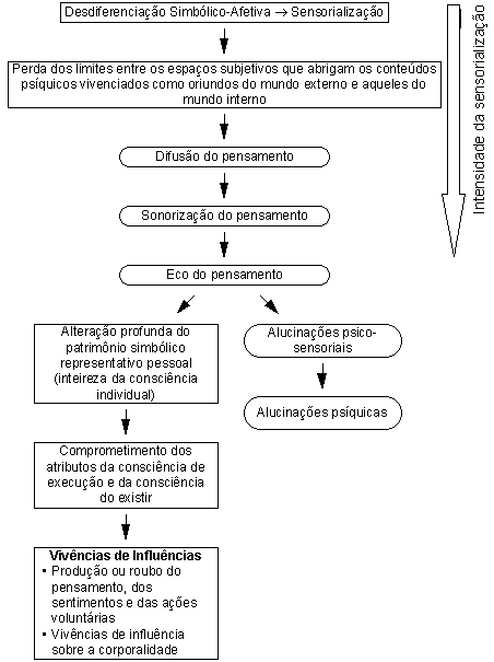 Como podemos notar na figura 01, enumeramos aquelas três alterações psíquicas fundamentais, postuladas na página 05, responsáveis pela gênese das vivências tipicamente esquizofrênicas e encadeadas na produção das experiência subjetivas sensorializadas dessa enfermidade. Podemos ver que após o fenômeno eco do pensamento há uma espécie de bifurcação. Do lado direito do diagrama, representamos, graficamente, o processo de sensorialização, somente, levando em primeiro lugar às alucinações psico-sensoriais e, finalmente, às alucinações psíquicas (processo de sensorialização total das representações simbólicas abstratas). Por sua vez, no lado esquerdo do esquema procuramos mostrar como o processo de sensorialização avançada aliado à alteração profunda, ou mesmo à dissolução, do patrimônio simbólico representativo pessoal e, como conseqüência, dos atributos da consciência de execução e da consciência do existir, ocasionam a totalidade das vivências subjetivas de influência dos enfermos esquizofrênicos. Temos oportunidade de observar, também, de maneira freqüente, na prática da clínica psiquiátrica, um outro tipo de fenômeno relacionado às vivências esquizofrênicas. Em determinadas ocasiões, os pacientes relatam apenas experimentar uma certa vivência subjetiva sensorializada, como as que vimos há pouco, sem, necessariamente, adjudicar algum juízo anômalo a essa mesma vivência. É o que costuma ocorrer no caso daquelas vivências já assinaladas acima, quais sejam, as de difusão do pensamento, sonorização e eco do pensamento. O paciente, em muitas ocasiões, apenas vivencia e assiste com enorme perplexidade, principalmente nas fases iniciais da psicose esquizofrênica, essas experiências subjetivas novas e extremamente atormentadoras sem compreender exatamente o que significam e de onde provêm. É compreensível que o psiquismo ao experimentar uma vivência essencialmente sensorial a considerará verdadeiramente real e procurará localizar, forçosamente, a sua fonte de produção no mundo externo. Entretanto, em um bom número de casos, quando indagamos ao paciente sobre esses tipos de vivência, o que ele considera sobre a sua natureza e origem, costuma responder que não sabe o que significam e de onde provêm, mostrando-se atordoado e atônito. Ao contrário, em outras ocasiões, e isso geralmente ocorre na instalação e cristalização definitiva do delírio primário da psicose esquizofrênica - o paciente vincula, convictamente e sem a menor dúvida, determinados juízos às vivências sensorializadas que experimenta. Assim, por exemplo, se antes da eclosão da doença nutria hostilidade ou ressentimento em relação ao seu vizinho, agora adquire certeza íntima irrefutável de que aquele o insulta constantemente com palavras de baixo calão e que está roubando o seu pensamento por intermédio de uma máquina diabólica e fantástica. Vê-se, com clareza, como o processo de sensorialização de conteúdos psíquicos simbólicos abstratos resulta em vivências eminentemente sensorializadas - no exemplo em questão em alucinações psico-sensoriais, sob forma de vozes que o enfermo acredita estarem sendo emitidas pelo seu vizinho e que ocupam o espaço subjetivo destinado aos conteúdos psíquicos interpretados como provenientes do mundo externo - que são projetadas em uma determinada pessoa situada no espaço exterior. É claro que o mecanismo psicológico da projeção é um evento psicodinâmico fisiológico, ocorrendo em condições normais e, predominantemente, em situações de desordens emocionais neuróticas. Entretanto, no caso do enfermo esquizofrênico ele projeta conteúdos psíquicos sensorializados no mundo exterior e os vincula a juízos delirantes, ou seja, há a transformação qualitativa da convicção pessoal de causalidade subjetiva em convicção reificada de causalidade objetiva, constituindo-se esta última em uma certeza permanente, irrefutável e cristalizada - ao contrário das projeções plásticas e flexíveis dos neuróticos que, potencialmente, podem elaborar-se, dissipar-se e reverter-se completamente no plano da consciência. Acreditamos que, além das inúmeras projeções seletivas que o doente inconscientemente engendra, muitas outras são efetivadas de maneira errática e indeterminada, vinculando-se as vivências sensorializadas a juízos delirantes direcionados praticamente ao acaso no que se refere a eventos e/ou pessoas do mundo externo. O exemplo mais clássico e chamativo daquelas projeções seletivas e que encontramos freqüentemente na clínica psiquiátrica cotidiana refere-se às figuras parentais do enfermo. É extremamente comum que este desenvolva um ódio aparentemente inexplicável e acentuado por um de seus pais, ou mesmo por ambos, o que algumas vezes, resulta em conseqüências trágicas e que pode ser explicado pela sensorialização de conteúdos emocionais agressivos dirigidos àqueles e que se vinculam a juízos delirantes. Após essas considerações em relação às vivências subjetivas sensorializadas, podemos classificá-las, basicamente, em duas categorias distintas: Vivências subjetivas