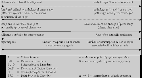 It can be seen that after Delusional Disorders (DD), it starts, from the schizoaffective pictures (S-A), a broad spectrum of psychotic clinical forms susceptible to treatment and control by lithium or other mood-regulating agents. Those pictures seem to consist in a real "spectrum of lithium psychoses", culminating in rather complex and atypical psychoid states, in which many times the therapeutic control is effective only if we associate lithium, valproic acid or neuroleptics at low dosages with antidepressants. To sum up, it is plausible to say that the theoretical model discussed here ¾ represented by the diagram above ¾ in spite of being similar to a continuum, it is not intended beyond being useful to daily clinical practice, aiding the physician in diagnosing correctly and establishing a suitable treatment for his/her patients. It is my belief that the contributions which might help the diagnosis exercise in this clinical activity will never be excessive as the practice of Psychiatry is undoubtedly the most complex and difficult of all medicine specialisation.